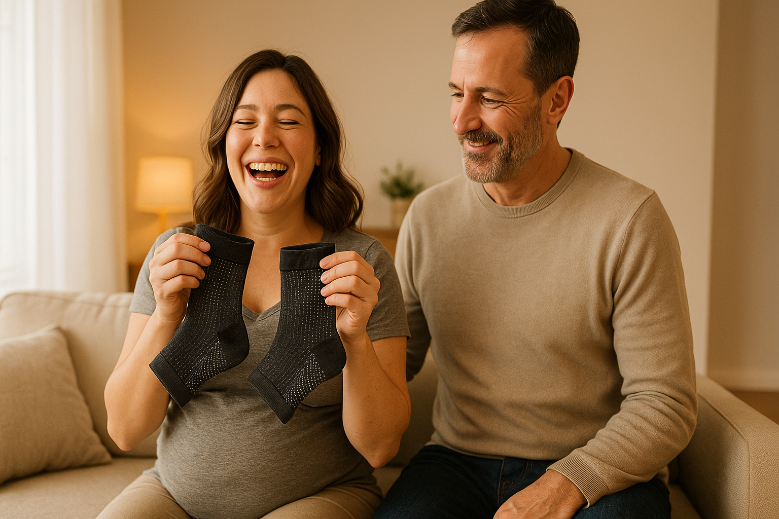 Eigentlich wollte ich die Socken zuerst gegen meine Plantarfasziitis testen – doch kaum lag das Päckchen auf dem Tisch, schnappte meine Frau sie sich. Wer könnte einer Schwangeren etwas abschlagen? Ihre Beine waren wirklich stark geschwollen, besonders um die Knöchel, also half ich ihr jeden Abend vor dem Schlafengehen, die Tieberg Kompressionssocken anzuziehen.
