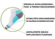 Eine Grafik der Tieberg™️ Energiesocken - Kompressionssocken zeigt spezielle Druckzonen an Achillessehne, Fuß und Ferse, Stabilitätsbänder mit Muskelausrichtung, gepolsterte Entlastungspads und Non-Slip Technologie - jeweils in deutscher Sprache mit Pfeilen beschriftet.